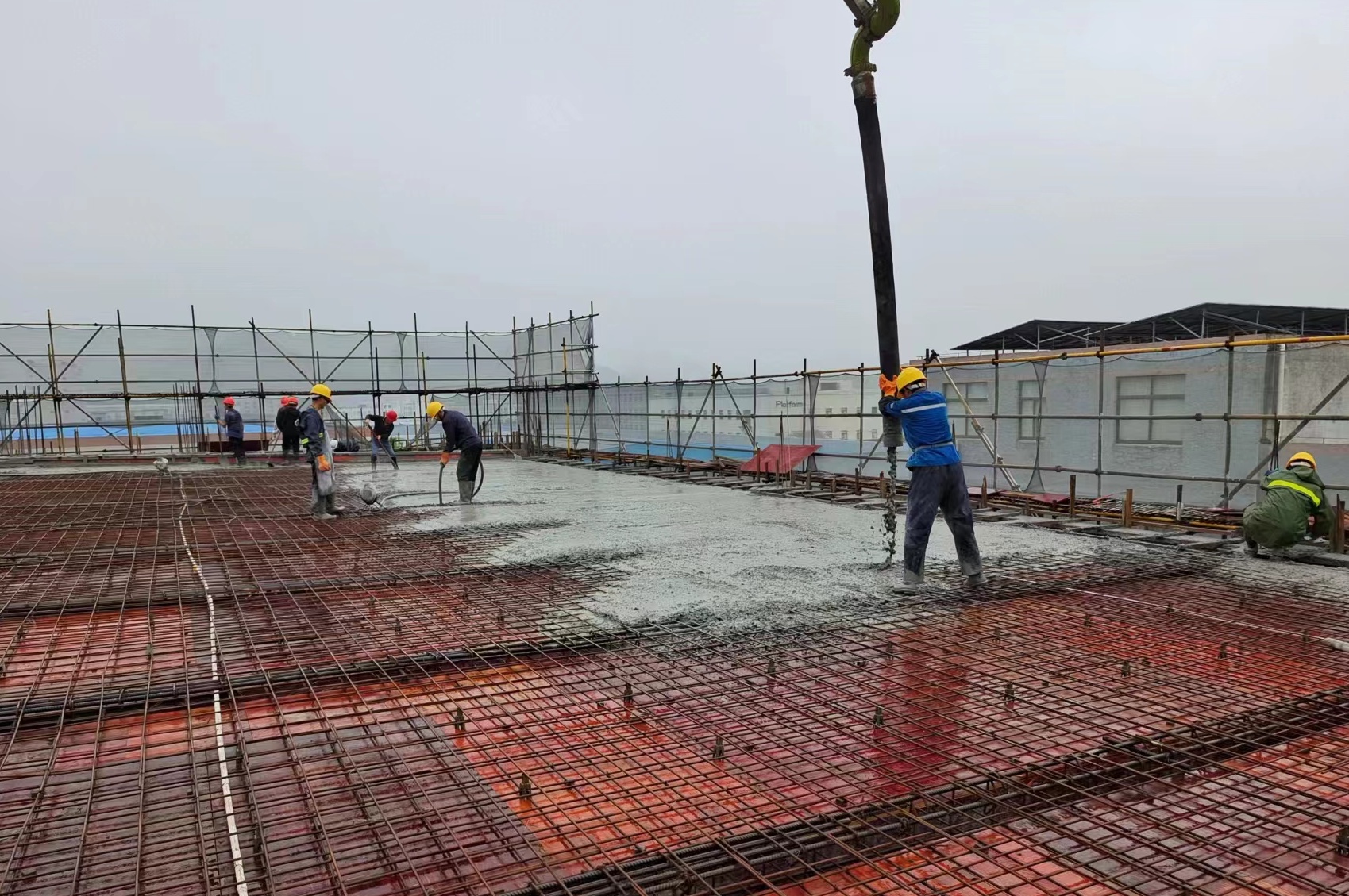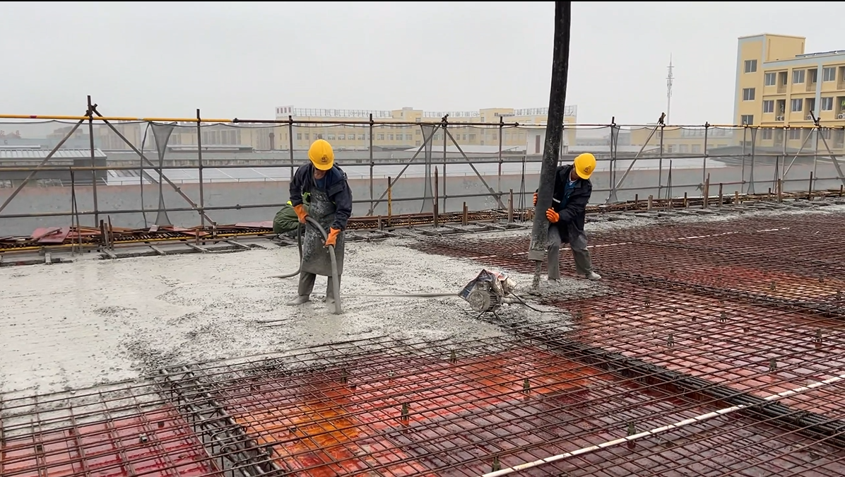 在工程现场,我们看到通过泵送设备,绿能珠低碳高性能混凝土被泵送到楼顶。