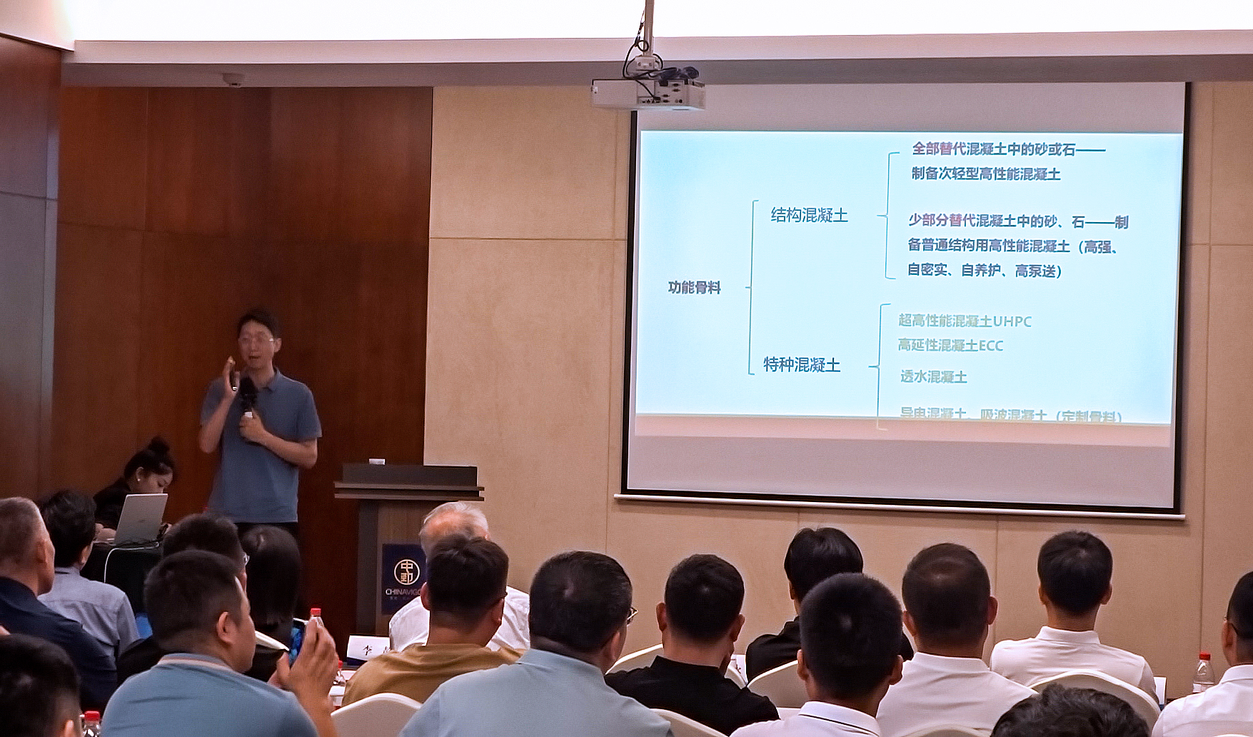 周永祥研究员针对功能骨料在混凝土中的应用技术及其发展前景发表演讲,他指出,我们所处的大基建时代需要消耗大量的土木工程材料,而混凝土在其中占据基础性地位。周博士强调,现代混凝土主要由水泥、砂子、石子、水和化学添加剂以及矿物掺合料六大组分构成,而功能骨料将成为未来混凝土的第七组分。功能骨料的加入,并不改变目前广泛使用的C30-C100结构混凝土的基本力学性能,它可以优化和改善砂石骨料的级配和粒形,并发挥良好的内养护功能,在凝胶材料总量不变的情况下,可以提高粉煤灰掺量,降低水泥用量,并能够显著提升混凝土的综合性能:改善混凝土施工性能、降低早期收缩开裂风险,降低碳化深度等。值得自豪的是,蒸压硅酸盐功能骨料,由我国独立研发、拥有完整知识产权的产品,并作为一种创新组分应用于结构混凝土,开创了新一代混凝土技术体系。