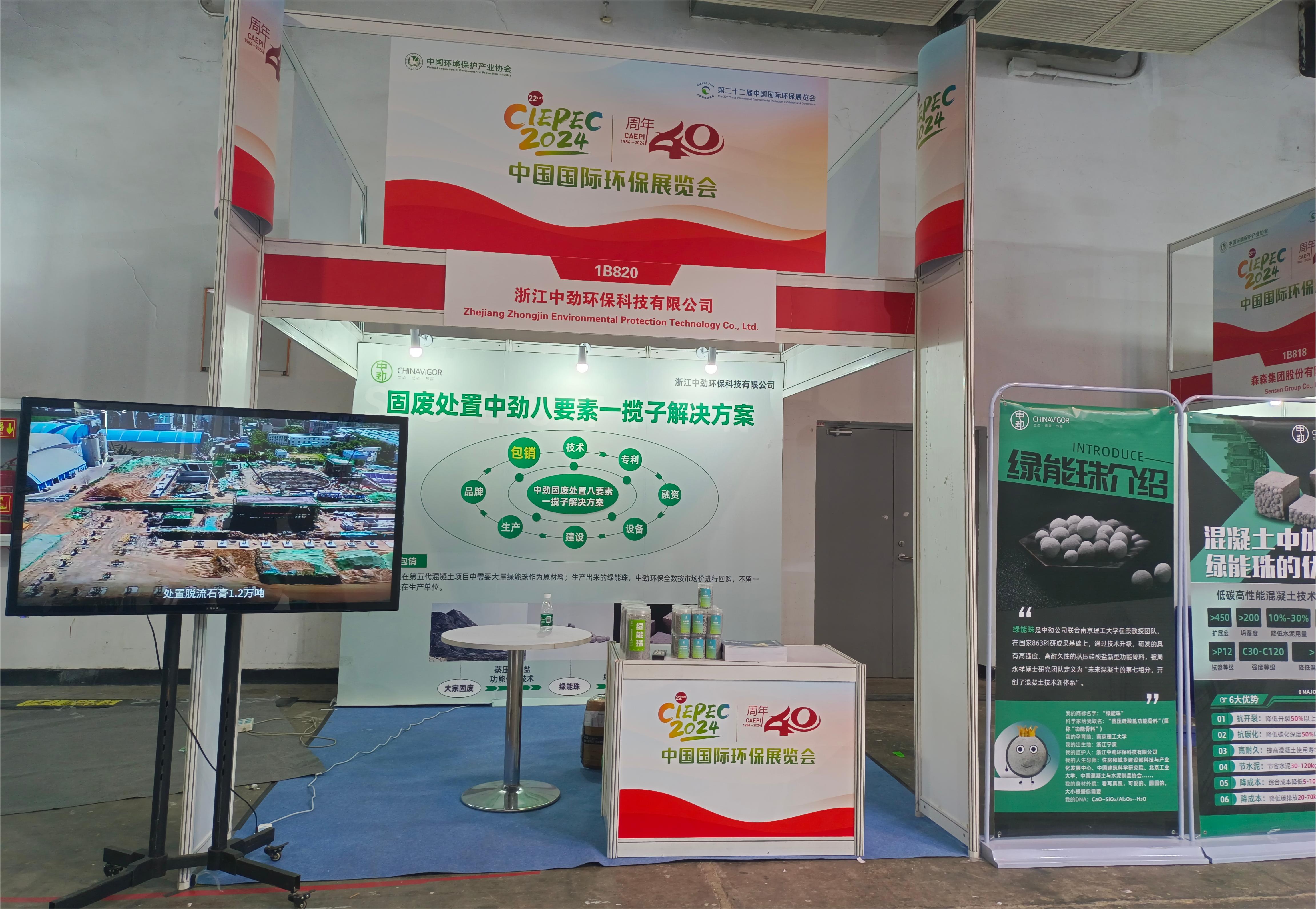 2024年4月10日至12由生态环境部、北京市人民政府等部门支持,中国环境保护产业协会主办的第22届中国国际环保展览会在北京·中国国际展览中心举办。同期举办2024生态环保产业创新发展大会及国内外生态环境治理、绿色低碳发展主题对接交流活动。百余家企业参会,中劲公司携固废处置新技术及环保新材料绿能珠参加了此次展会。