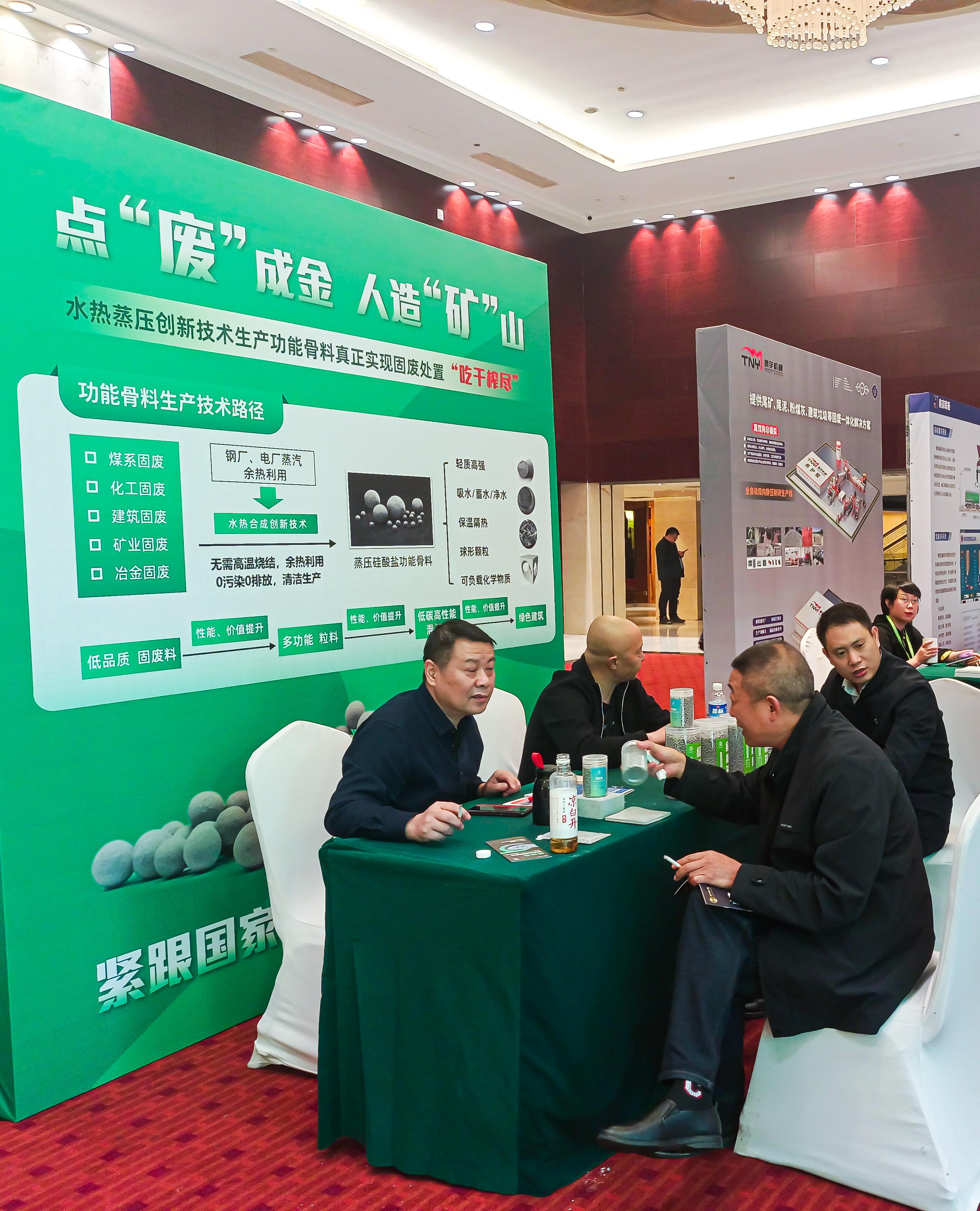 中劲公司水热合成蒸压固废处置技术吸引了参会客户的目光,展台前咨询洽谈客户络绎不绝,公司董事长李天君亲自为大家答疑解惑。水热合成蒸压技术做为一种全固废利用,无三废排放的创新工艺可以真正实现固废利用的吃干榨尽,实现变废为宝的三次价值提升。