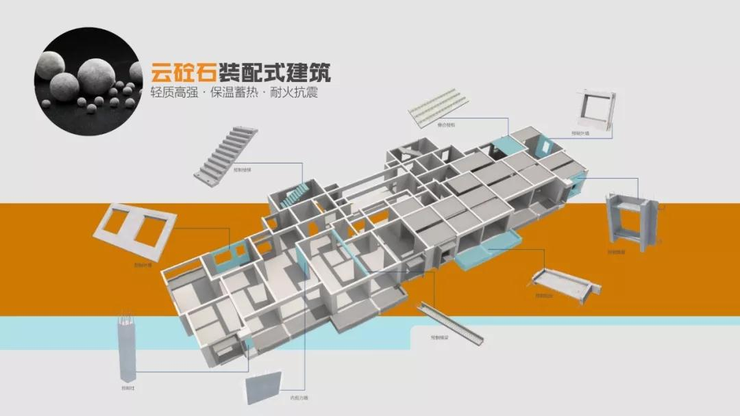 混凝土是装配式建筑中预制构件的主体,而骨料是混凝土的主要组成部分,起骨架和支撑作用,直接影响着预制构件品质。云砼石作为高强轻骨料应用于装配式建筑,可生产板材、梁柱、装配式构件、楼梯等。云砼石混凝土比普通混凝土减重20%以上,导热系数仅为普通混凝土的一半,具有良好的保温性,可在轻质保温装配式建筑构件上得以应用。